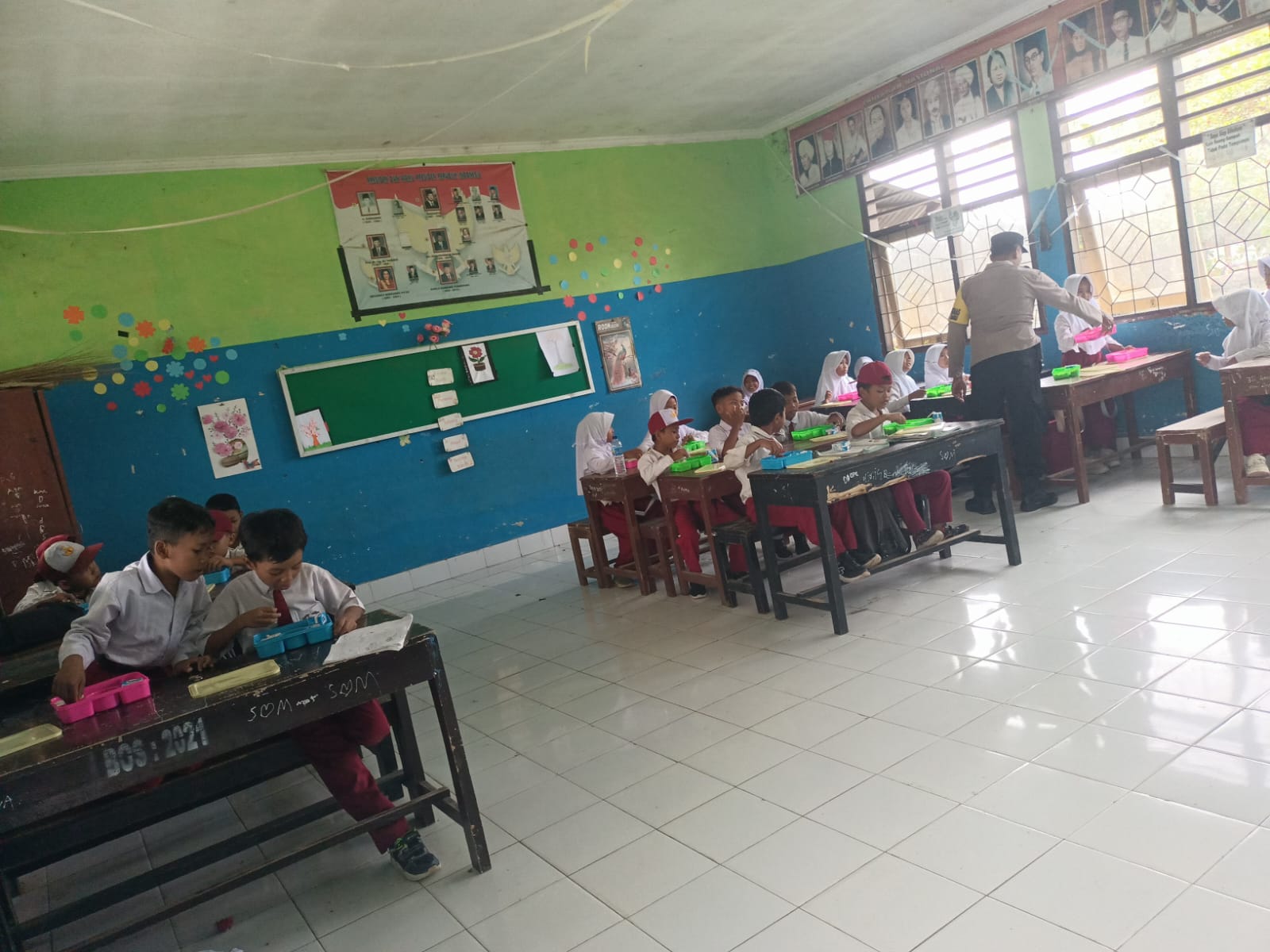 Dalam pelaksanaannya, AIPDA Khairul Iman melakukan monitoring secara langsung proses pembagian MBG. Ia memastikan mitra catering, UD. Shakila Catering, membagikan makanan bergizi secara langsung kepada siswa, dimulai dari kelas 3B. Proses pembagian makanan ini juga turut dibantu oleh para guru SDN 2 Ombe.
