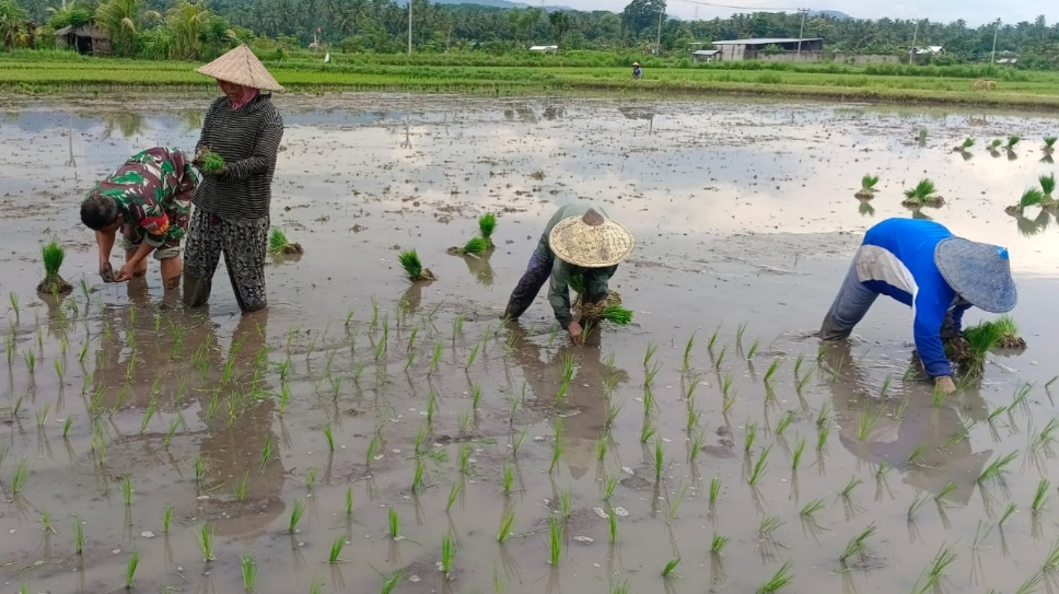 Lombok Utara, NTB – Sebagai bentuk kepedulian terhadap sektor pertanian dan ketahanan pangan nasional, Bintara Pembina Desa (Babinsa) bersama Kelompok Tani (Poktan) Pudukan Eleh turun langsung ke sawah dalam proses tanam padi di Desa Sokong, Kecamatan Tanjung, Kabupaten Lombok Utara (KLU), Jum’at (27/2/2025).
