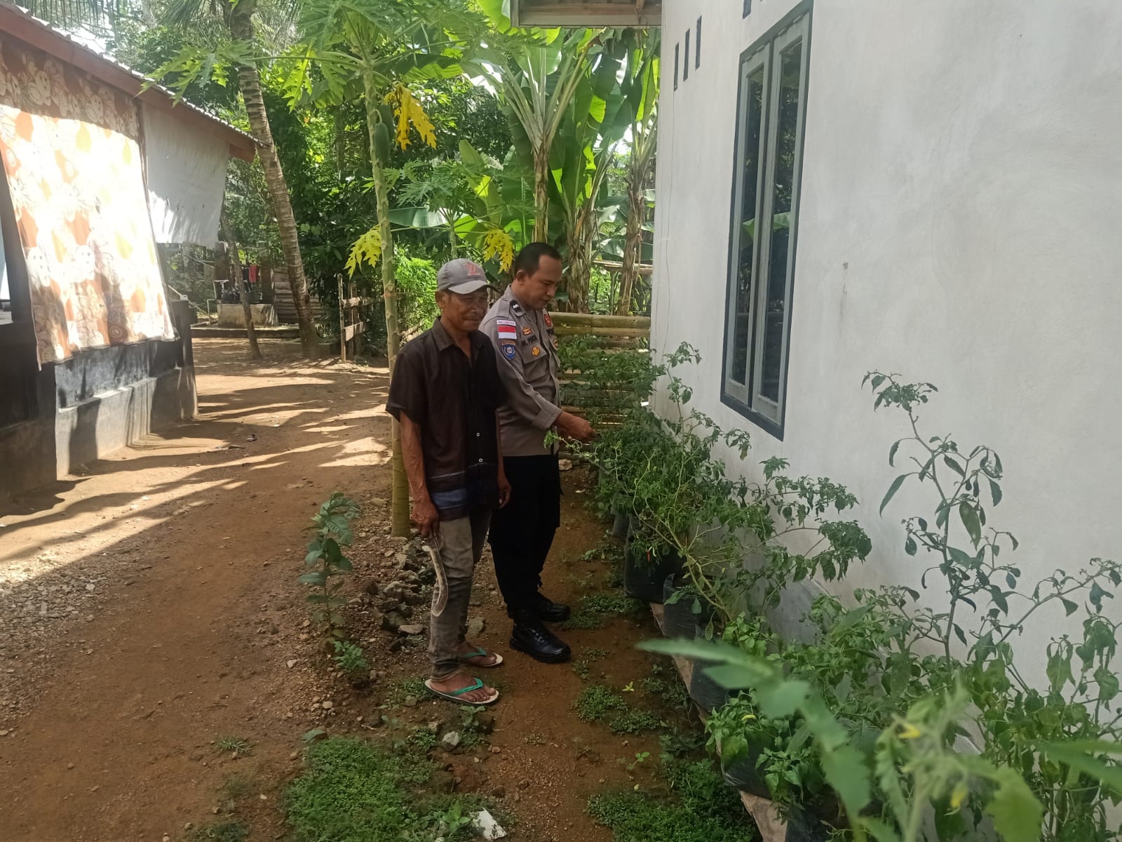 Dalam kunjungannya, Bhabinkamtibmas warga sedang merawat tanaman cabai dan tomat yang ditanam di pekarangan samping rumahnya.