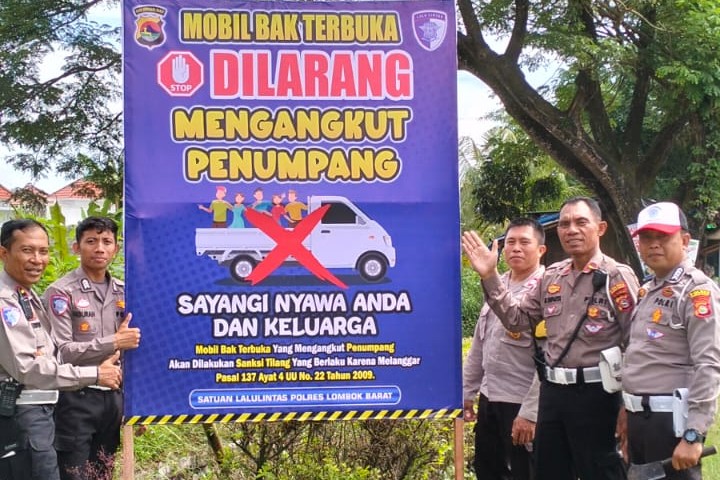 Selain itu, Satlantas Polres Lombok Barat juga memasang spanduk himbauan yang secara spesifik melarang penggunaan kendaraan pickup atau bak terbuka untuk mengangkut penumpang.
