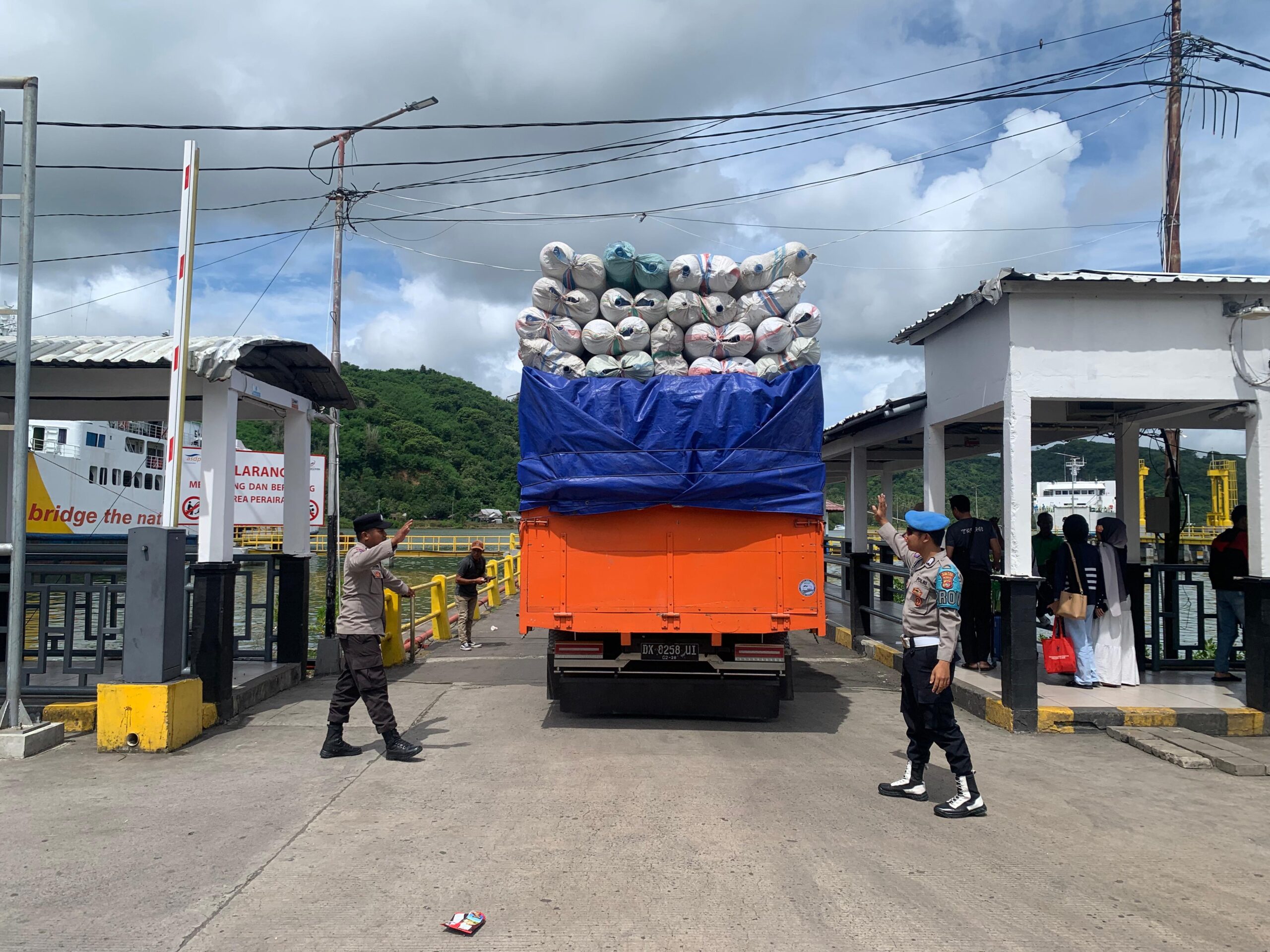 Personel Polsek Kawasan Pelabuhan Lembar melaksanakan kegiatan pengamanan pemuatan penumpang dan kendaraan ke atas kapal yang akan bertolak dari Pelabuhan Penyeberangan PT. ASDP Lembar, Rabu (7/5/2025).