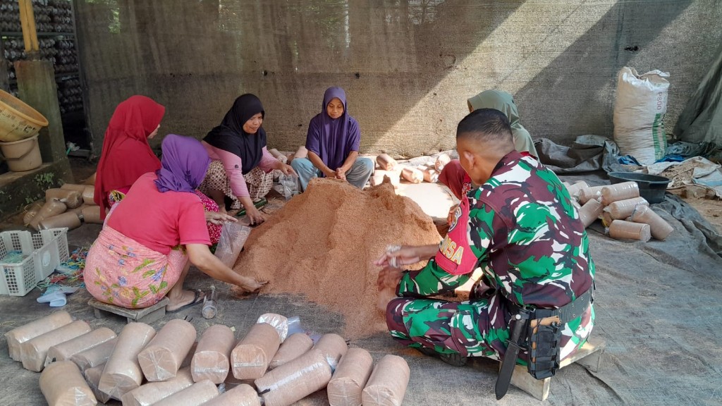 Lombok Barat, NTB – Dalam semangat membangun ketahanan pangan dan meningkatkan kesejahteraan ekonomi masyarakat desa, Bintara Pembina Desa (Babinsa) Taman Sari, Komando Rayon Militer (Koramil) 1606-07/Gunungsari, Serka I Gede Sika turun langsung mendampingi budidaya jamur tiram yang digerakkan kelompok ibu-ibu di Dusun Medas Barat Kokoq, Desa Taman Sari, Lombok Barat, Nusa Tenggara Barat, Minggu (8/6/2025).